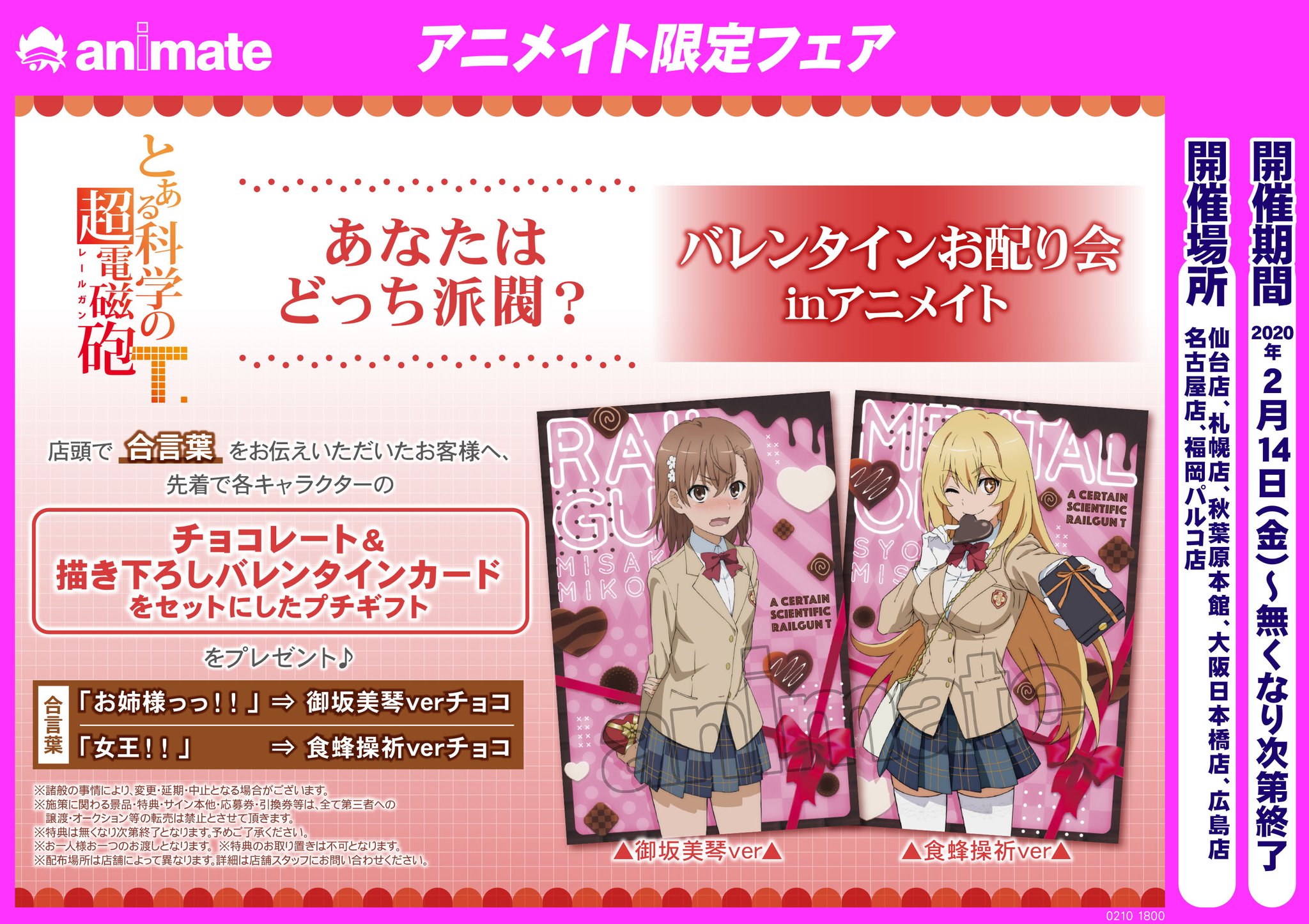 【バレンタイン情報】「とある科学の超電磁砲 T」あなたはどっち派閥? バレンタインお配り会 inアニメイト 決定しましたーー🍫♥店頭でのお配り方法や場所などの詳細は追って発表致します!!#とある科学の...