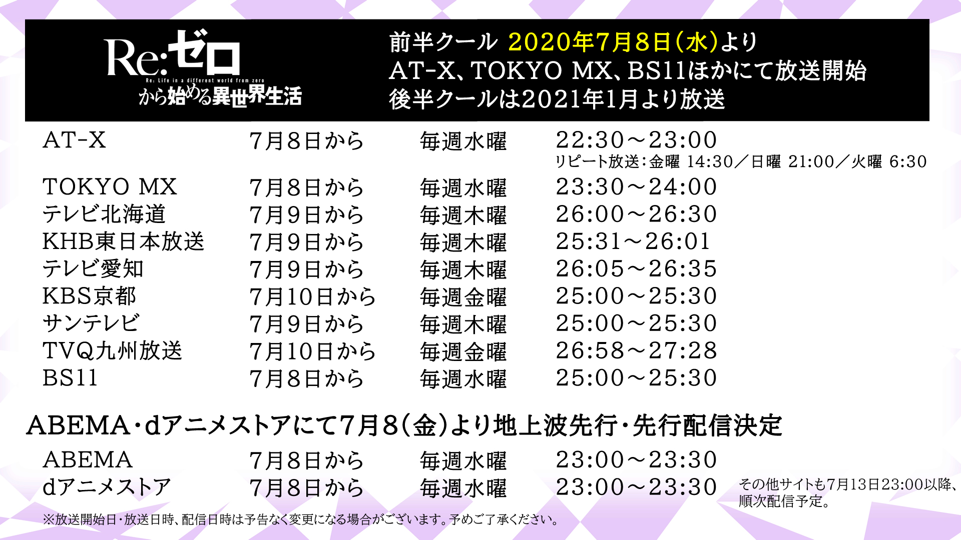 『Re:ゼロから始める異世界生活』2nd season📺放送・配信情報📺2020年7月8日(水)よりAT-X、TOKYO MX、BS11ほかにて放送開始!後半クールは2021年1月より放送開始!ABE...