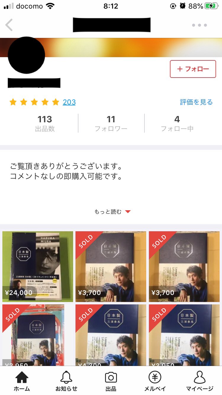 メルカリのほんの一部。三浦春馬くんの日本製の高額転売。この人だけでも約50冊。三浦春馬くんを餌にするなよ。赤ちゃん服出品してるんだから私と同じ小さい子の母親なはず。モラルのない母親で悲しいよ私。こんな...